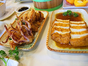 水鴨舌翼、鹵水豆腐、 皮燒豬頸肉、椒鹽鮮魷、蠔油芥蘭等等,以蘿蔔糕和椒鹽